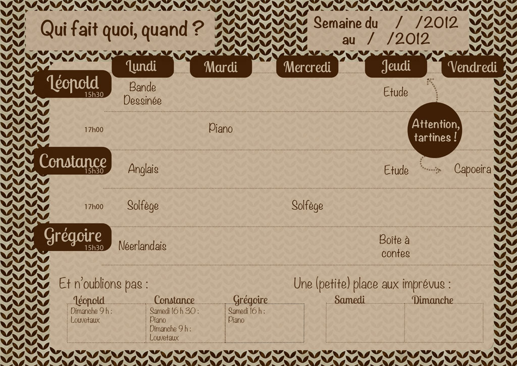 Brève description de la bête : il y a place pour 3 enfants, mais si vous faites partie des petits joueurs qui n’ont que deux loulous, la dernière ligne peut tout aussi bien servir à autre chose. Comme par exemple indiquer qui dans la famille est chargé d’aller chercher les enfants et quel jour c’est prévu.