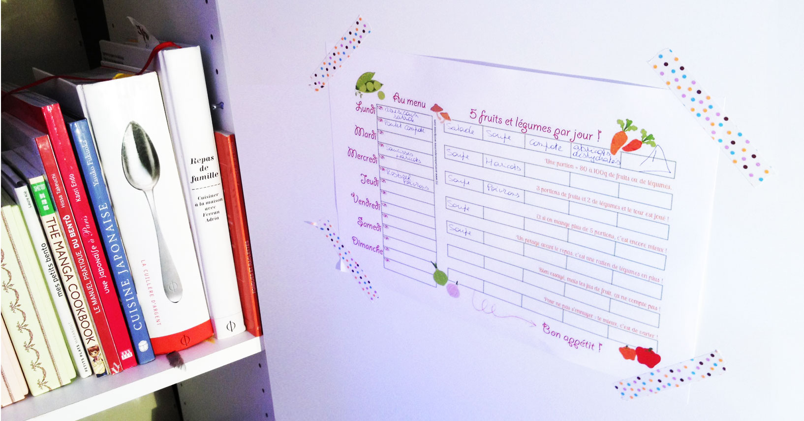 J’ai abandonné l’idée de trouver une raison à cette haine viscérale. Mais, malheureusement pour eux, pas celle qu’ils devront se nourrir sainement tant qu’ils vivront sous mon toit. Alors, pour eux, pour moi, et pour tous les parents qui vivent la même chose à la maison, j’ai créé un outil qui permet de planifier les menus sur la semaine tout en faisant le point sur la consommation de fruits/légumes de la famille.