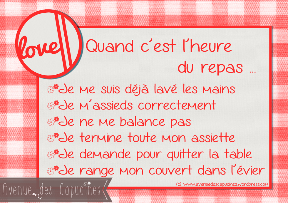 Et j’ajouterai pour les plus petits: je goûte les aliments qu’on me sert! J’ai une fille difficile et c’est la règle qu’on lui applique avant de se mettre à table. Elle mangerait toujours les mêmes choses et ça marche plutôt bien!