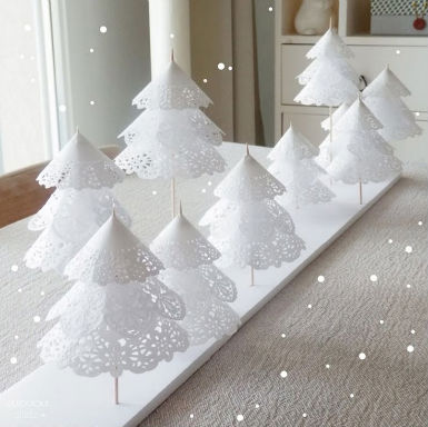 On peut aimer Noël sans avoir envie d’un grand sapin chez soi. Avis aux aiguilles-lergiques, cette petite forêt de napperons de papier est pour vous. (Mode d’emploi)